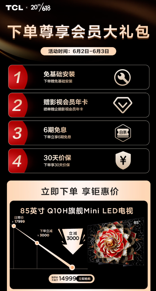 值得注意的是,618期间TCL 85Q10H下单立减3000元,同时还可以享受免基础安装费、赠影视会员年卡、6期免息、30天保价等诸多优惠,可以说是质价比拉满,这也就不难理解为什么其销量一路高涨了,强烈建议有电视换新计划的朋友重点关注。