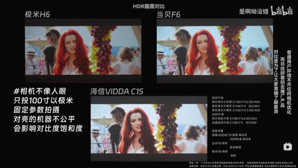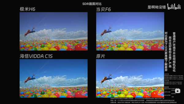 从SDR画面可以看到极米H6的亮度是最暗的,海信C1S的画面和原片差距大,只有当贝F6的色彩呈现是和原片相符合的。