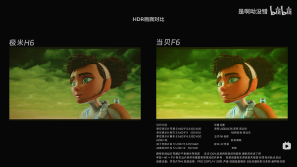 从HDR画面上来看,极米H6的画质依然是最差的,当贝F6的色彩饱和度和对比度都要好很多。