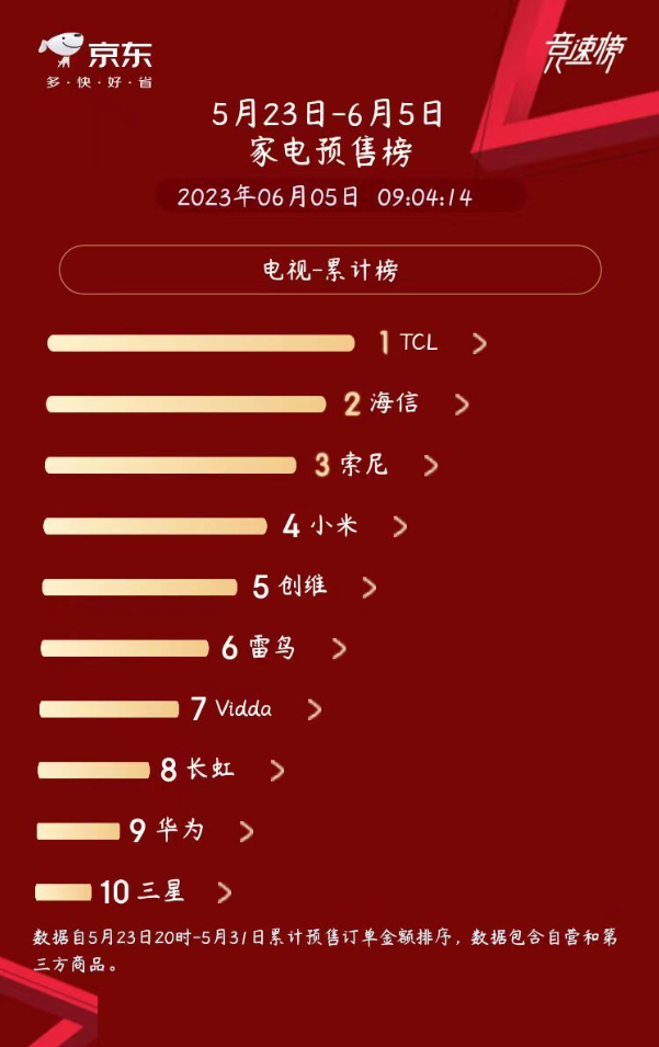 强悍的画质实力,使得TCL X11G自发售之日起就一机难求,而在618期间,更是多平台直降4000-5000元,这使得其成为了618期间最火爆的高端旗舰电视,也助力TCL持续领跑京东家电预售榜。