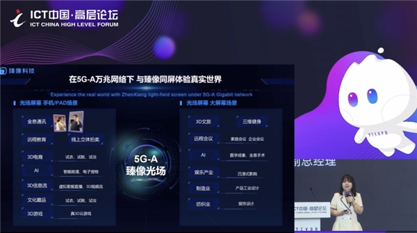 作为裸眼3D屏的全球领军厂商,臻像科技副总经理孙雪君女士同时受邀参加5G-A联合倡议仪式,并作主题分享,介绍了臻像超密集视点分布的真3D屏幕——光场全息屏独特的显示特点,以及5G和光场技术未来在三维通讯、三维云游戏等应用的融合场景。