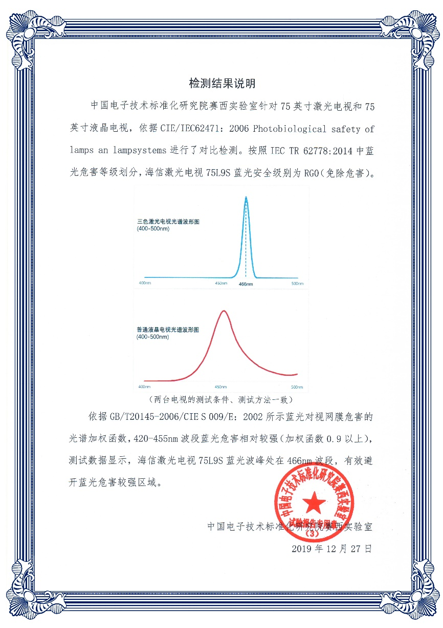 国家直属权威检测机构中国电子技术标准化研究院赛西实验室和北京协和医院眼科专家,通过人群相同条件下观看激光电视和液晶电视的严格对比试验,测试数据分析显示:受试者观看液晶电视后单眼视力、泪膜破裂、睫状肌和眼部主观感受4项指标出现明显变化,眼胀、眼痛、畏光、眼干涩、视物模糊等感受加强;受试者观看激光电视后,视力、眼部主观感受等关键指标变化不明显。研究发现:在3米视距范围内,观看激光电视比观看液晶电视人眼感觉更舒适,更有利于保护眼部健康,激光电视是具有良好视觉舒适性的显示产品。