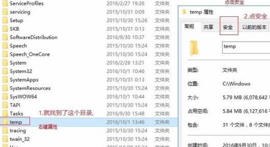 3、在c盘windows文件中找到“temp”文件,右击选择“属性”,点击“安全”。
