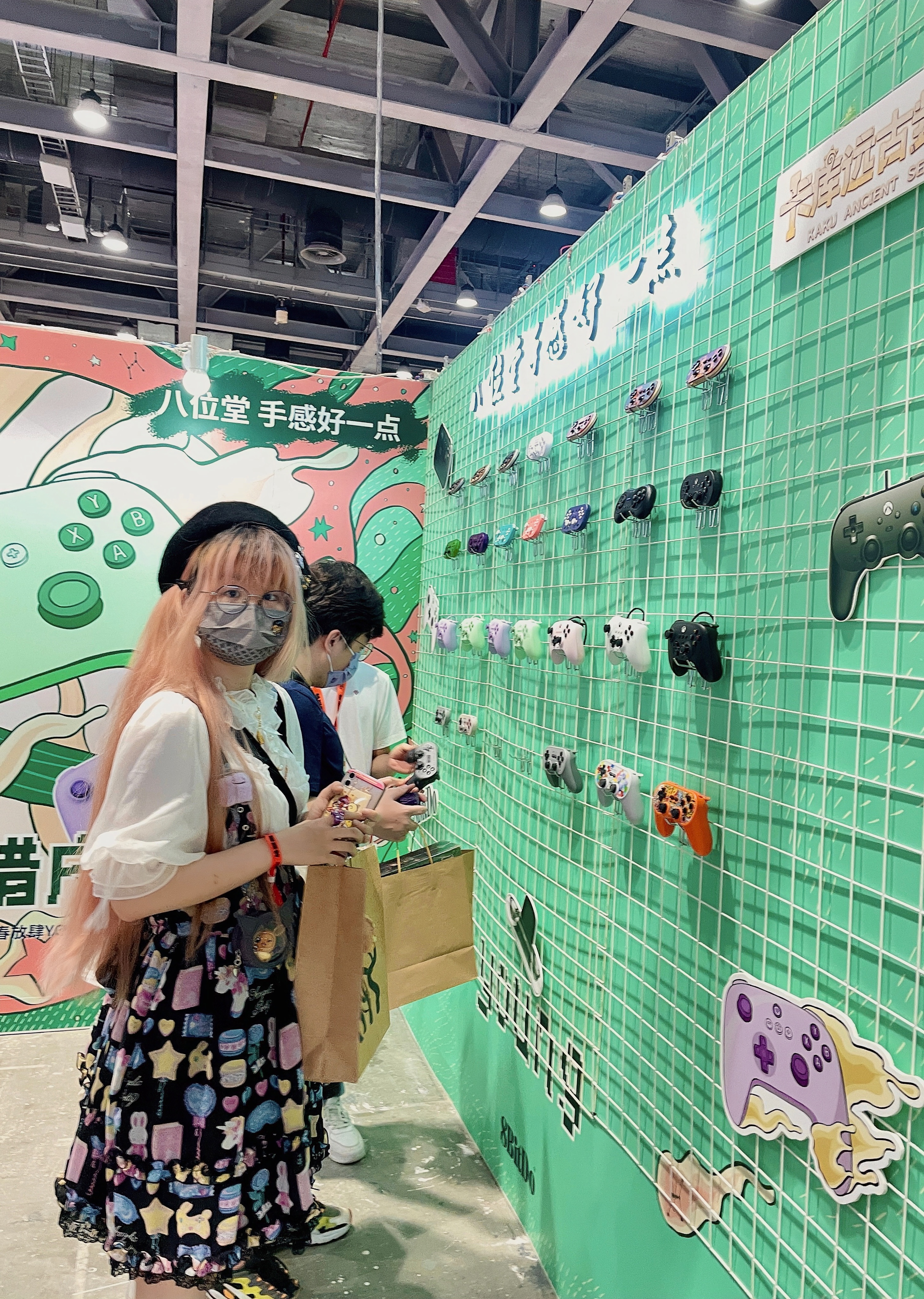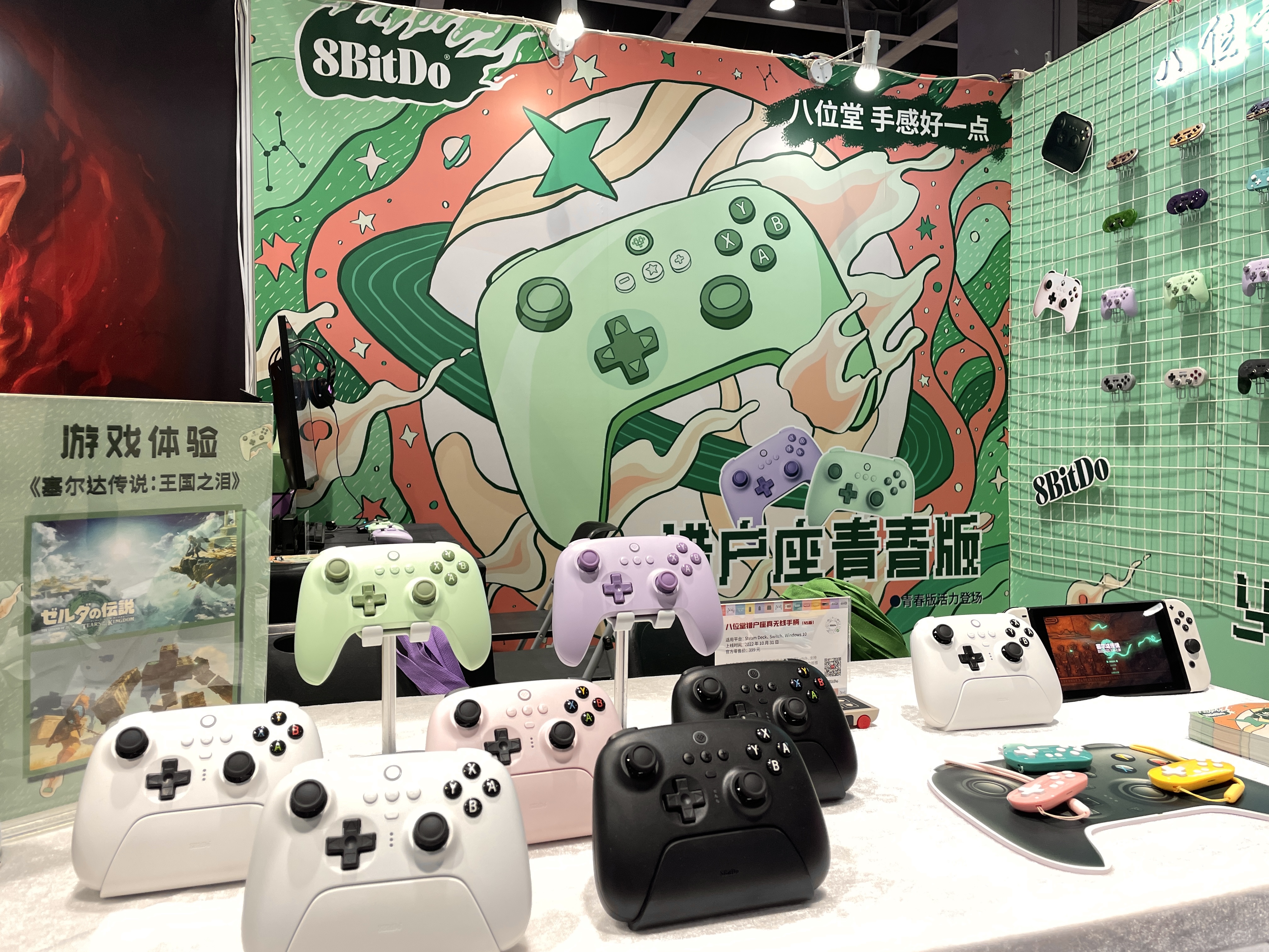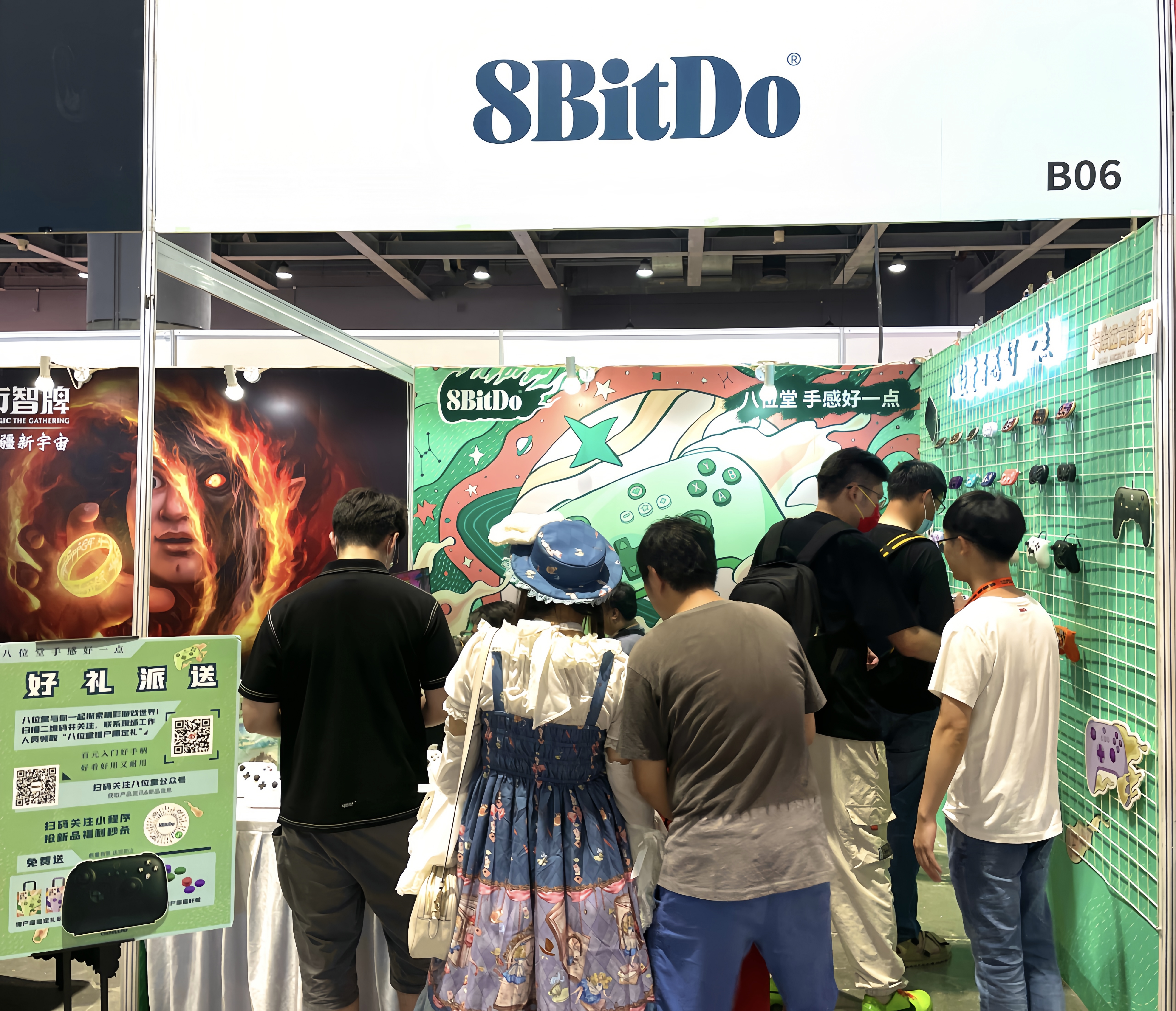 知名游戏外设品牌八位堂(8BitDo)设在【B06】的展位是最热闹的区域之一,展位上展出了八位堂刚刚发布的猎户座青春版手柄,提供了《极限竞速 地平线 5》 《塞尔达传说》 等精彩的游戏的试玩体验,还有参与打卡互动领取限定礼品的活动,吸引了很多游戏爱好者来打卡互动。