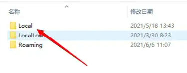 3、点击打开AppData目录下的Local文件夹。