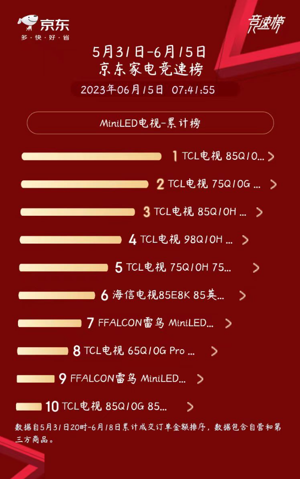 不得不说,作为Mini LED技术领导者,TCL在终端产品的打磨上确实具有自己独特的优势。值得一提的是,Q10H电视目前也是高居618 Mini LED电视销量榜TOP 3,而整个TOP 10榜单中TCL一家就占据了9款,这大概就是硬实力吧!现在已经下单了,就等着送货上门了!