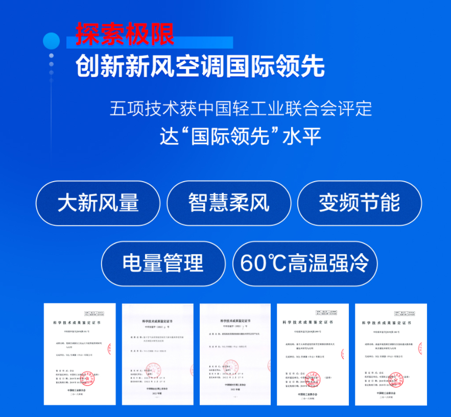 同时还拥有五项国际领先技术:大新风量低噪音技术、变频节能技术、智慧柔风技术、60℃高温强冷技术、电量可视化技术。