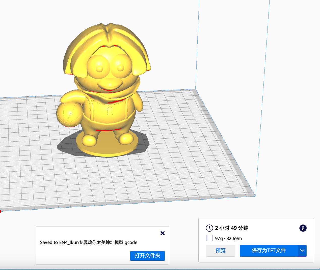 比如我打印这个“只因”,模型的三维是 88.9*68.8*119.8mm,模型的大小有 32M 左右,需要的耗材重量为 97g,所使用的打印速度为 250mm/s,打印时间为 2 小时 49 分钟。 Neptune 4 支持最大 225*225*265mm³ 尺寸的模型打印,基本是能够满足我日常需求的大小了。