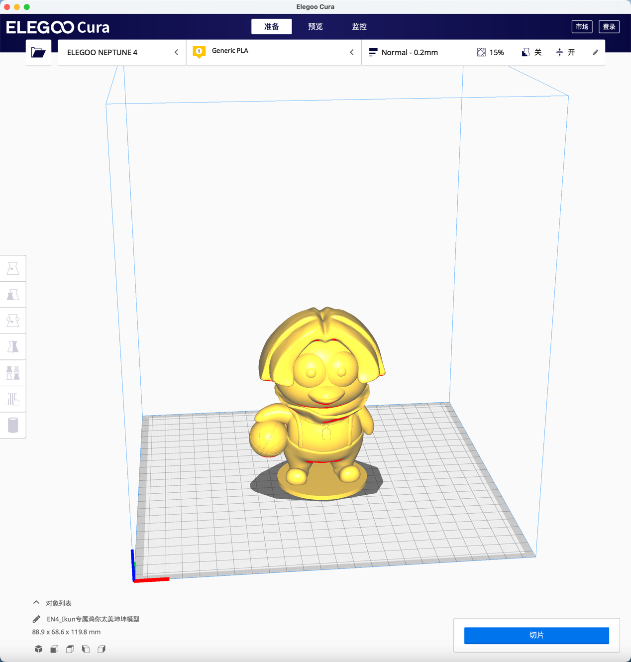 切片软件不需要任何学习成本,只要把下载的模型文件导入,然后点击切片就可以了,如果模型较大,也可调整模型倾斜角度,再使用软件自带的一键添加支撑功能即可,在完成切片后还会直接计算模型的大小,大约所需要的耗材重量以及当前打印设置下所需要的打印时间等等,清晰明了,不过我建议大家在保存切片文件时尽量命名为英文或拼音,因为 Neptune 4 打印选项中不支持显示中文,如果有多个模型同时存在时可能就分不清到底想要打印的是哪个模型了。