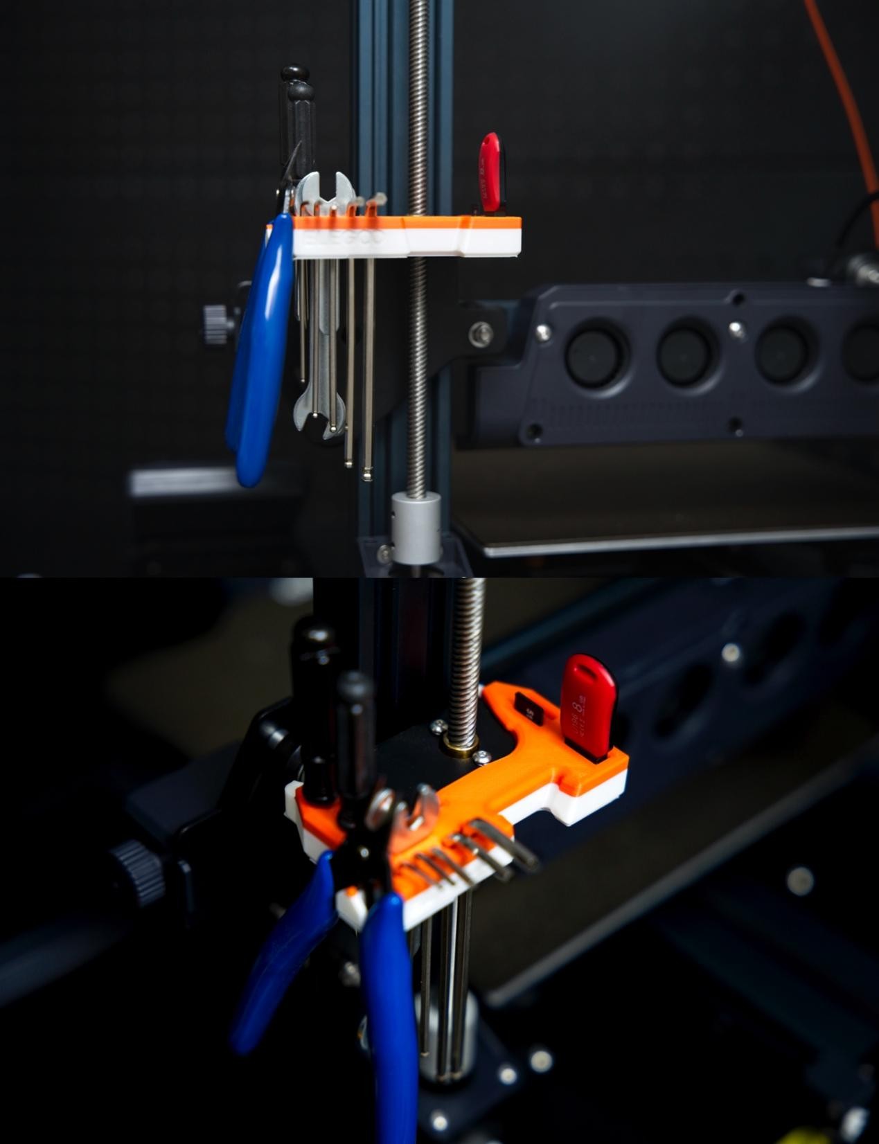 另外我也尝试打印了一个 Neptune 4 的小配件,可以将 Neptune 4 安装所需要用到的各种螺丝刀、钳子以及打印用的 U 盘全部收纳起来固定在 Neptune 4 龙门架上,从这些配件的开孔来看,基本是每个工具对应的放置口都非常准确,也说明了 Neptune 4 的打印精度确实非常高。