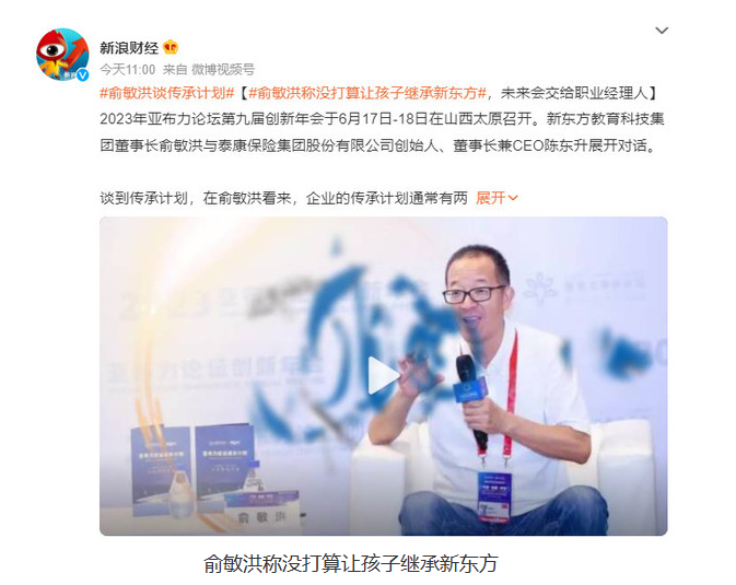 俞敏洪在演讲中提到了企业的传承计划,他认为通常有两种方式,一种是家族传承,另一种是管理人传承。他表示,新东方未来将采取管理人传承的方式,因为他从未打算让自己的孩子来接任新东方的事业,无论是教育板块还是新近创办的东方甄选板块,以及未来即将推出的新东方文旅板块。俞敏洪称,他的目标是在与董事会领导和股东真正优秀的配合下,选出最优秀的管理者来继承新东方的发展。