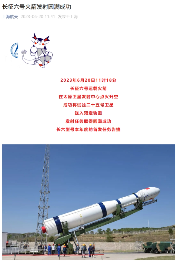 【本站】6月20日消息,中国航天科技集团今日表示,当地时间11时18分,长征六号运载火箭在太原卫星发射中心成功点火升空,顺利将试验二十五号卫星送入预定轨道,本次发射取得了圆满成功。