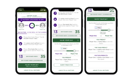 其次是AI抽签分析。这项功能可以提供每位球员的赢球几率分析。IBM基于他们之前开发的"IBM Power Index"和"赢球几率"两种预测模型演化而来。IBM Power Index利用自然语言处理技术收集和分析球员的平时状态,从而推测球员的精神和发挥水平。而赢球几率分析则基于球员的实力数据,包括世界排名和对手实力等。这些分析指数将会以尺标刻度和级别显示,并随着比赛的进展而更新,直到球员被淘汰。