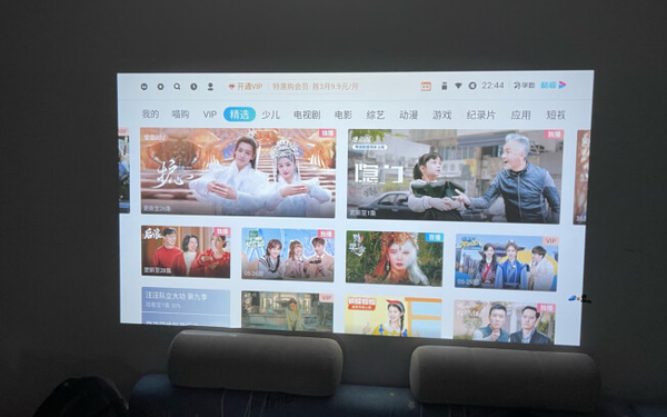 自带安卓系统,桌面和其它千元大众投影仪桌面基本类似,固定内容,以影音综艺等频道,横向变换。支持智慧对焦,和全自动4向梯形校正辅助功。