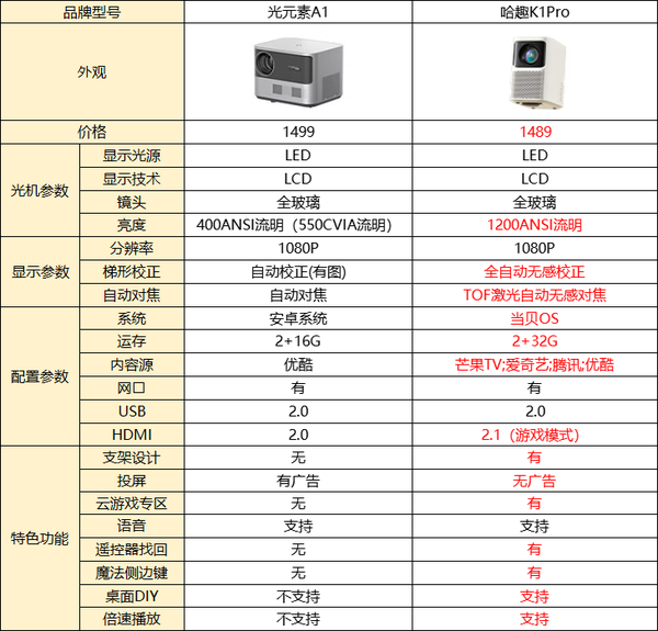 一图了解光元素A1和哈趣K1Pro,2款投影仪参数配置不同。