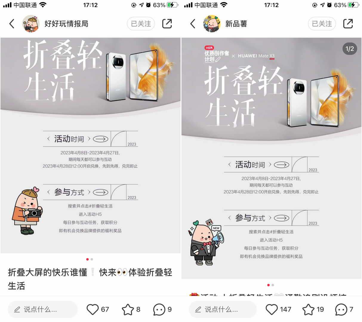 本次活动由小红书两大官号@新品薯和@好好玩情报局联合品牌官方号@华为终端共同官宣,发起#折叠轻生活 话题活动,号召用户参与 H5 打卡活动。积分任务同步上线,多重互动全方位构建品牌体验,打响营销第一枪。