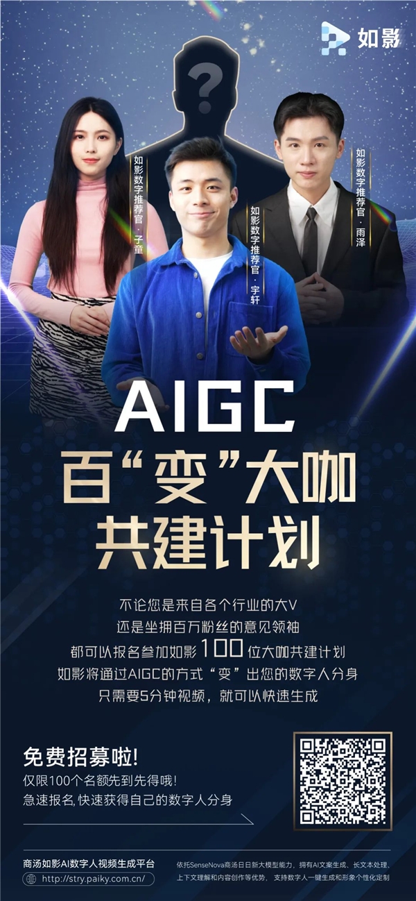 伴随如影APP正式上线,商汤同步开启AIGC百“变”大咖共建计划,面向各行业募集100位大咖,帮助打造高质量的数字人分身。不论是行业专家、专栏作者、KOL,还是带货达人,均可报名参加,与商汤共创数字人的多样可能。