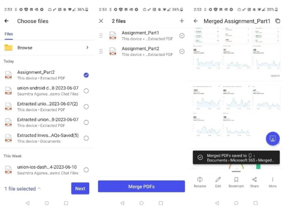 另外,付费订阅的安卓Microsoft 365 Insider成员还有机会体验到合并PDF文件的功能。用户只需进入“选择文件”页面,选择要合并的PDF文件,然后点击“下一步”按钮和“合并PDF”按钮,即可快速合并文件。在点击“下一步”按钮之前,用户还可以自由选择PDF文件的合并顺序。