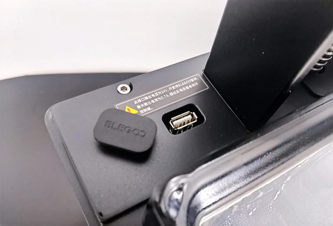 土星3U的屏幕后面有两个USB插口,我们可以把爱乐酷送的一个空气净化器安装在这里,当然另一个USB口也不是摆设,它可以用于拓展双空气净化器使用,进一步净化打印环境。不仅如此,土星3U还在盖子后方设计了一个开槽,可以外接空气净化器,让打印环境不受空间限制。