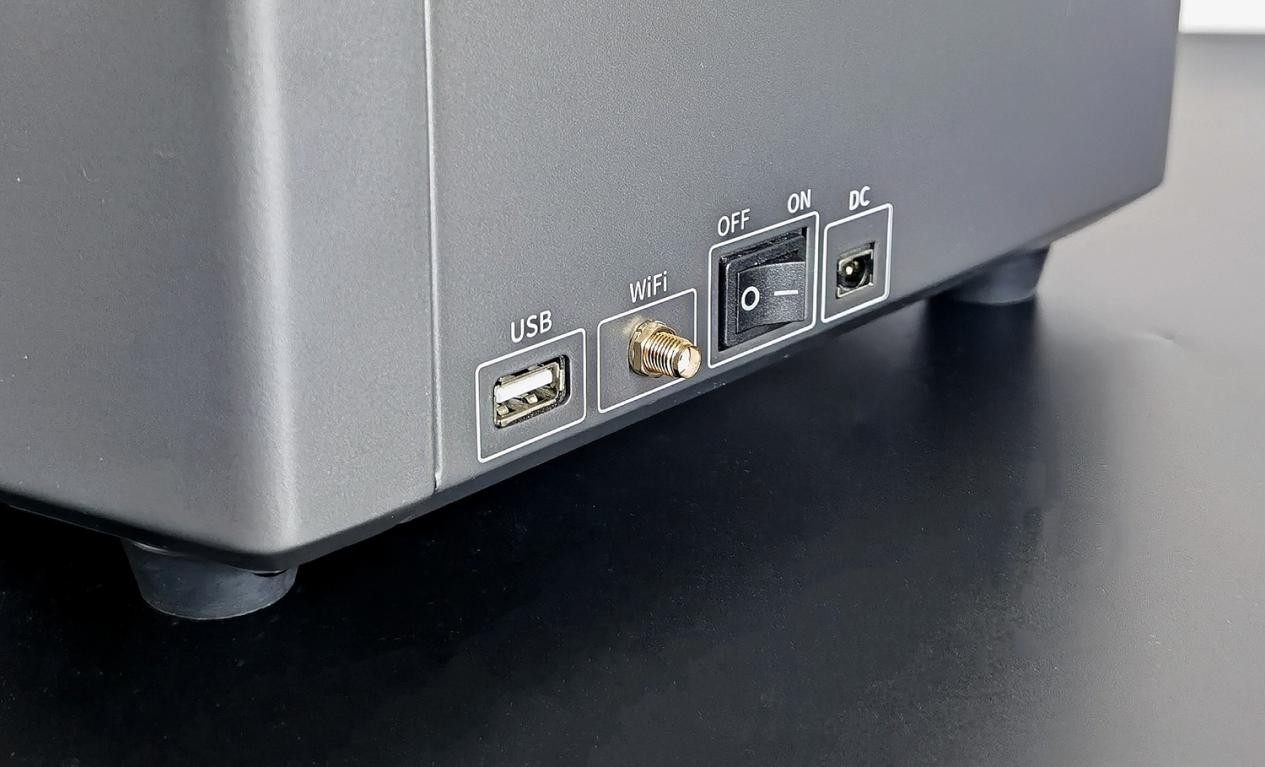 侧面可以看到土星3U的开关和接口,包括USB孔、WiFi天线接口、电源按键和电源接口。看到WiFi天线接口就知道土星3U它支持WiFi传输功能,不用插U盘也可以传输文件,传输速度能达6-10Mbps,兼容2.4G和5G网络,使得传输文件变得更加方便,这功能真的大大好评。