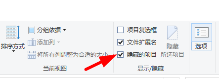 2. 然后去勾选“隐藏的项目”就可以显示隐藏的系统文件夹了。