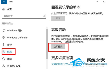 2. 在左侧导航栏中选择【恢复】选项,然后在右侧找到并点击【高级启动】下方的立即重启按钮。