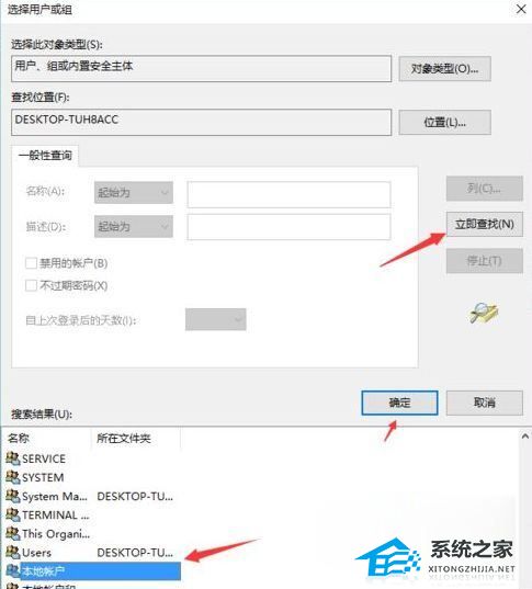 2. 我们点击 更改->高级->立即查找,在下方的框框找到本地账户。点击,确认。再点击一次确认。