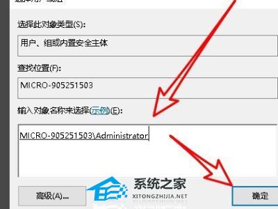 5. 接下来在打开的选择用户或组的页面中,我们在输入对象名称页面中输入超级管理员的账户administrator,然后点击右侧的“检查名称”按钮。
