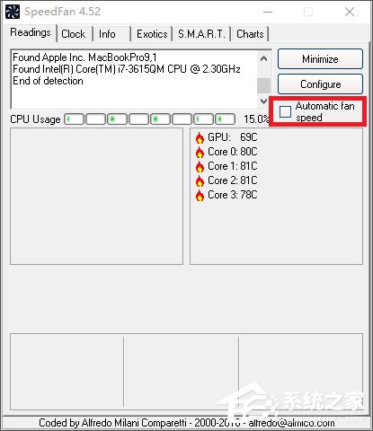 1. 如果台式机电脑没有专业的温控或风扇控制软件,那我们就需要用到一款SpeedFan软件,下载地址:点此前往,启动后它会在界面直接显示出电脑硬件的温度(主要是处理器. 主板和显卡的温度),懒人可以勾选“Automatic fan speed”让它自动控制风扇。