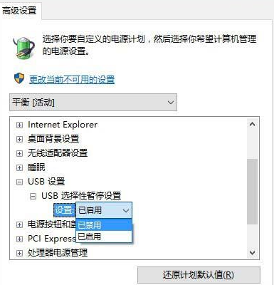 3. 展开后找到“USB选择性暂停设置”,然后选择“禁用”。
