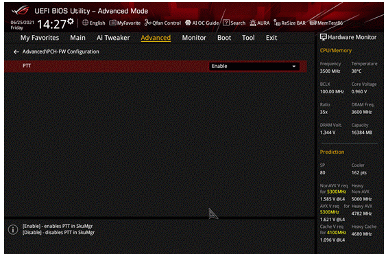 在英特尔平台中,TPM是被称为PTT功能的,在多数主板上都是默认关闭,一般来说对应的选项会放在Advanced/进阶项目中,具体位置根据主板的不同会有所差异,但多数都是与PCH有关的设置里,找到对应的项目并选为开启即可。