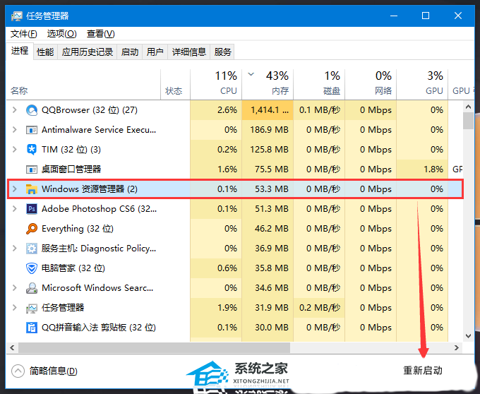 5. 打开任务管理器后,在进程选项卡下,找到并选择Windows 资源管理器,然后点击右下角的重新启动即可。