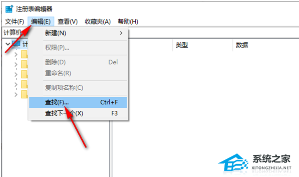 2. 之后会打开一个注册表页面,在该页面中将【编辑】选项进行点击,在菜单选项中选择【查找】。