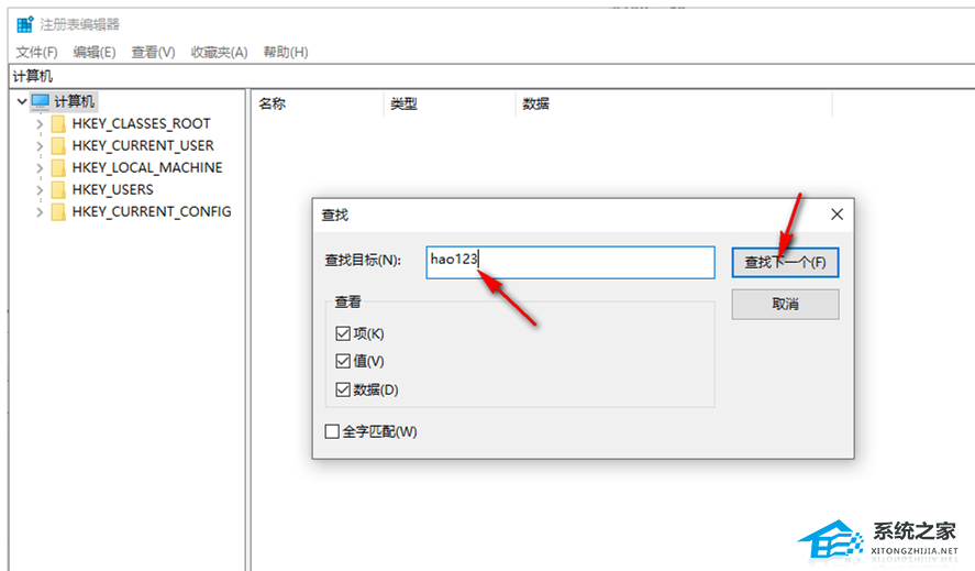 3. 随后就会弹出一个查找的窗口,在该窗口的【查找目标】中输入【hao123】,之后点击【查找下一个】。