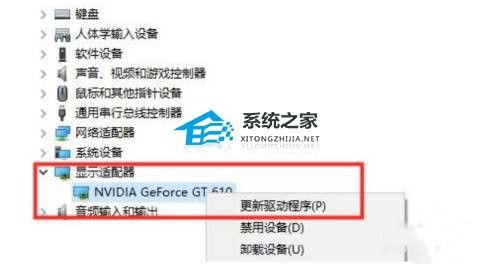 3. 在设备管理器界面的列表中找到“显示适配器”,右键点击我们的“显卡”选项,然后点击“更新驱动程序”。