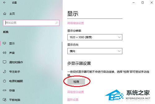 2. 点击进入“系统”,单击“检测”,此按钮可以帮助操作系统检测其他显示器,特别是如果它们是旧型号。您也可以在这里连接到无线显示器。