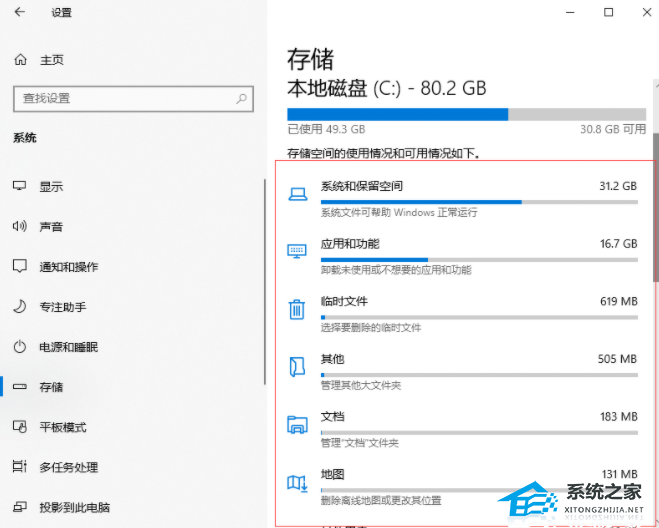 2. 点击左上角的系统选项进入到系统设置,在选项里我们就会发现有个存储的选项。里边显示了电脑各个磁盘目前的空间利用情况。