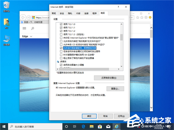 5、接下来回到 Internet 属性窗口中,点击右上角的“高级”选项卡。在打开的高级窗口中找到“允许运行或安全软件 ,即使签名无效”前面的复选框,最后点击确定按钮即可。重新启动计算机,再次安装插件就不会再弹出上面的错误提示了。