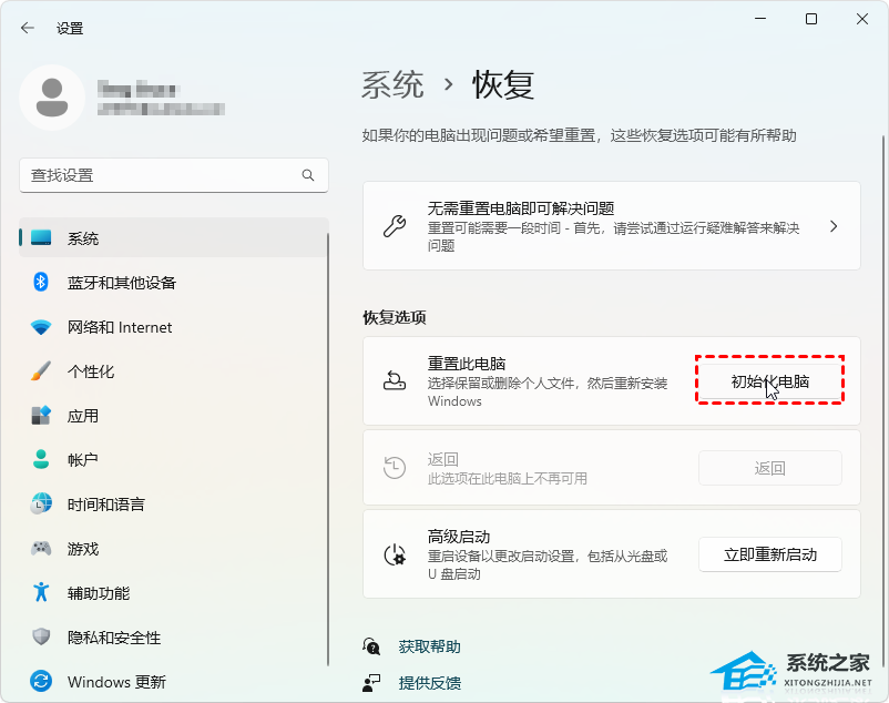 2. 在左侧菜单中,选择恢复,然后在重置此 PC下,单击开始使用选项。