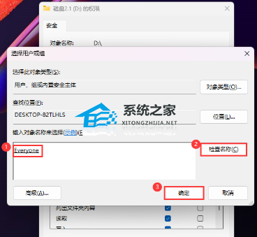 4. 以输入对象名称来选择(示例)(E):文字框中输入【Everyone】,点击【检查名称】,再点【确定】。