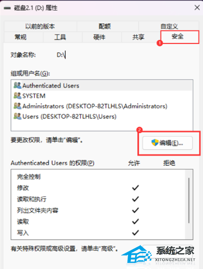 2. 切换到【安全】选项卡,再点击【编辑】;