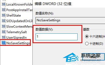 4. 最后将其命名为“NoSaveSettings”双击打开,将数值数据改为“1”。