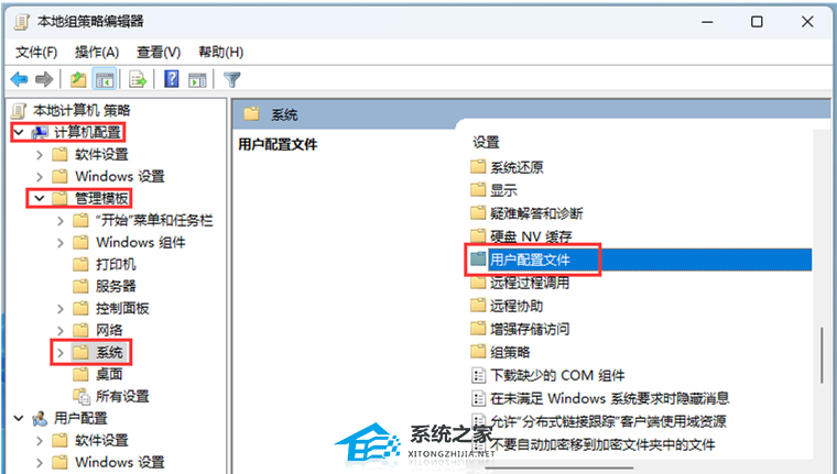 2. 本地组策略编辑器窗口,依次展开到【计算机配置 - 管理模板 - 系统 - 用户配置文件】;
