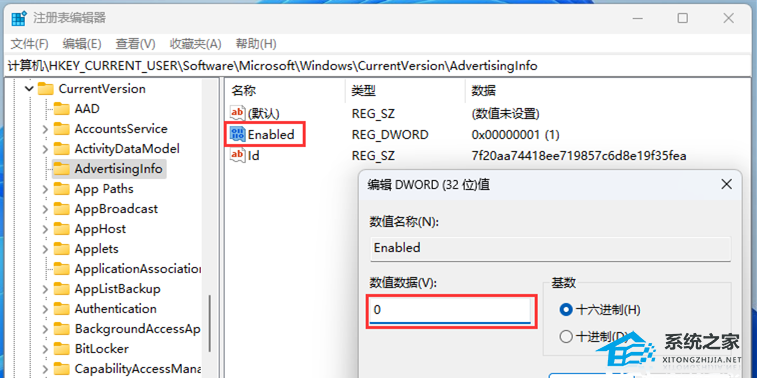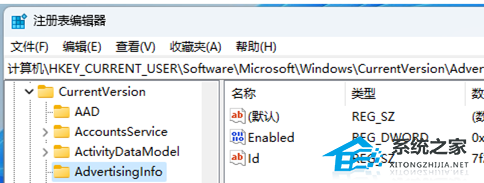 2. 注册表编辑器窗口,依次展开到以下路径【HKEY_CURRENT_USERSoftwareMicrosoftWindowsCurrentVersionAdvertisingInfo】;