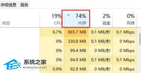 2. 展开“内存”选项卡并通过向下箭头查看内存占用高的进程。