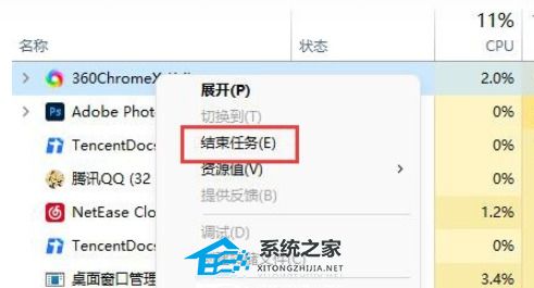 3. 找到占用率高且不必要的进程,右键点击并选择“结束任务”,从而降低内存占用。