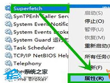 2. 在打开的服务窗口中查找“Superfetch服务”,右键点击并选择“属性”。