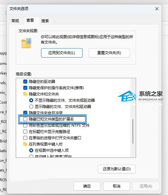 3. 打开「文件夹选项」窗口后,点击「查看」选项卡 – 在「高级设置」中勾选或取消勾选「隐藏已知文件类型的扩展名」。勾选此选项会隐藏扩展名,取消勾选则会显示扩展名。