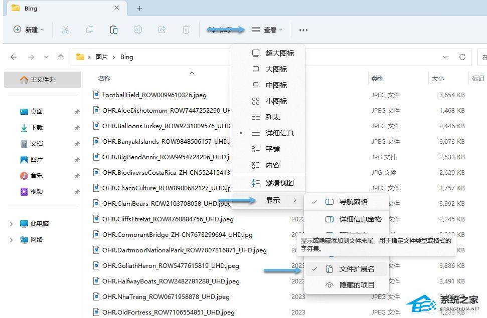 2. 点击顶部的「查看」菜单 – 然后选择「显示」- 勾选和取消勾选「文件扩展名」选项,可以显示和隐藏文件扩展名。