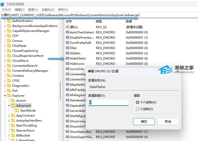 3. 新建或修改名为 HideFileExt 的 DWORD(32 位)值 – 将其实值设置为 0 可以显示 Windows 11 文件扩展名,设置为 1 则隐藏扩展名。